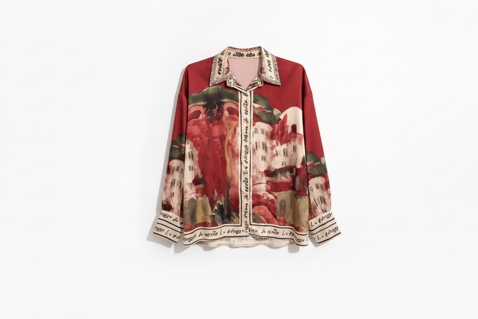 This exquisite women's button-up shirt is a true work of art, designed to elevate your wardrobe with its unique and captivating aesthetic. The fabric, likely a luxurious silk or a high-quality blend, drapes beautifully, offering a sophisticated silhouette that is both comfortable and stylish. The shirt features a classic collared design and long sleeves, making it a versatile piece that can be dressed up or down. What truly sets this blouse apart is its striking artistic print. The print depicts a charming European-inspired scene, complete with architectural elements and subtle figures, rendered in a painterly style. This artful design transforms the shirt into a wearable masterpiece, perfect for those who appreciate unique fashion and artistic expression. The print is set against a deep black background, which makes the vibrant colors and intricate details of the artwork pop, creating a visually arresting effect. The collar and cuffs are accented with a contrasting border, adding a touch of refined detail. The overall impression is one of effortless elegance and sophisticated flair. This shirt is ideal for a variety of occasions, from a casual day out exploring vineyards, as suggested by the backdrop, to a more formal gathering. It can be paired with tailored trousers for a polished office look, or with jeans for a chic, casual ensemble. The long sleeves offer adaptability, allowing for the shirt to be worn fully buttoned or open over a camisole. The relaxed fit ensures comfort without compromising on style. This blouse is a testament to fashion as a form of self-expression, allowing the wearer to showcase their individuality and refined taste. It's a piece that will undoubtedly become a conversation starter and a cherished addition to any fashion-conscious woman's collection. The combination of the classic shirt silhouette with an avant-garde print creates a harmonious blend of timeless appeal and contemporary design, making it a truly standout garment.