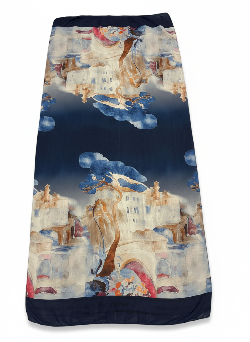 Italian hand-made scarf featuring a stunning watercolour print, blending rich tones with an artistic, ethereal design. A timeless accessory crafted with elegance.