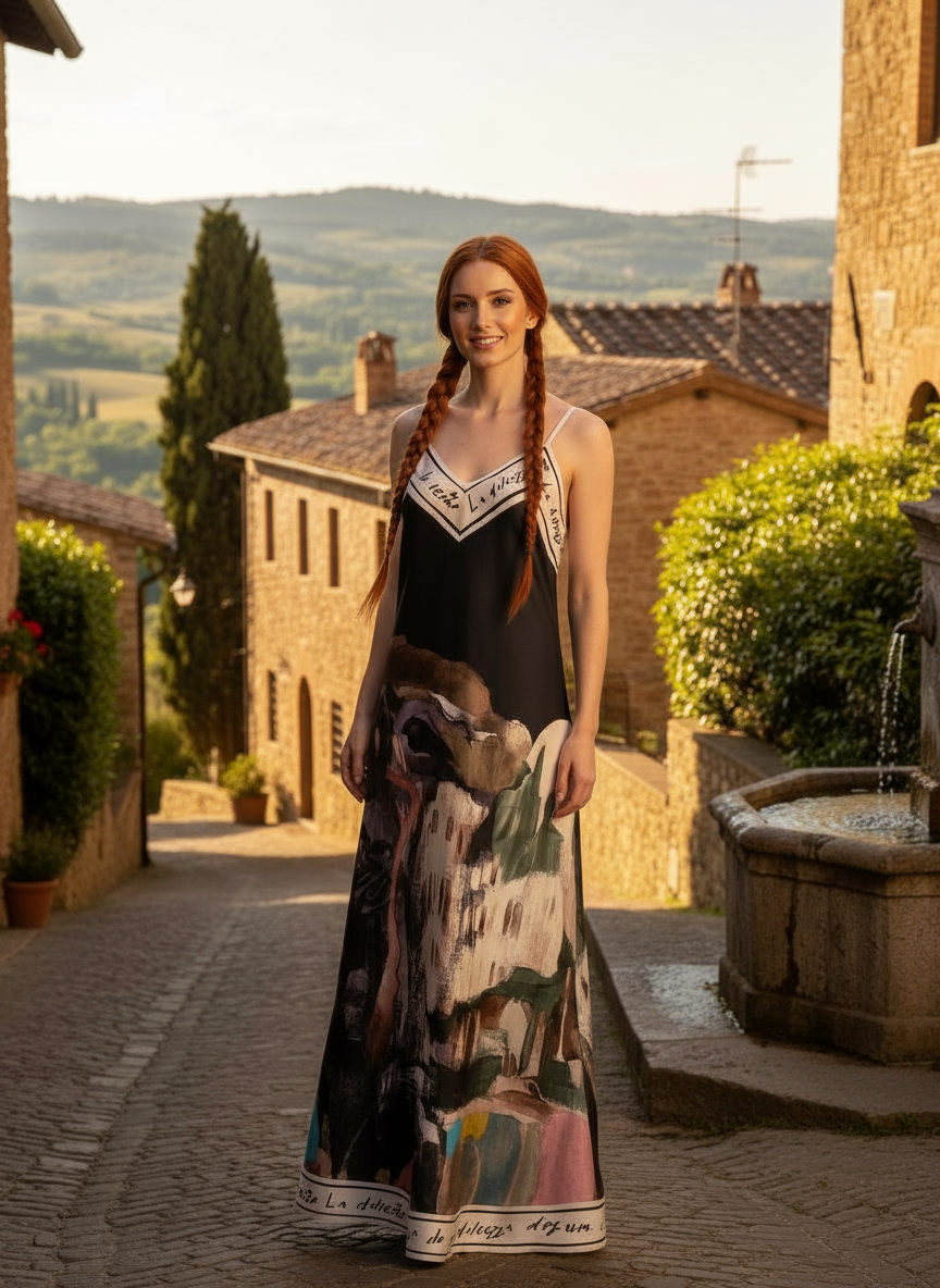 This stunning Italian hand made maxi dress combines effortless elegance with vibrant artistry. The vivid, painterly design captures the spirit of Puglia with effortless sophistication. Crafted from premium quality, Italian water coloured print, it offers a lightweight, flowing silhouette that drapes beautifully for both casual and refined occasions. Designed as one size fits most, this elegant versatile statement piece will refine your wardrobe.